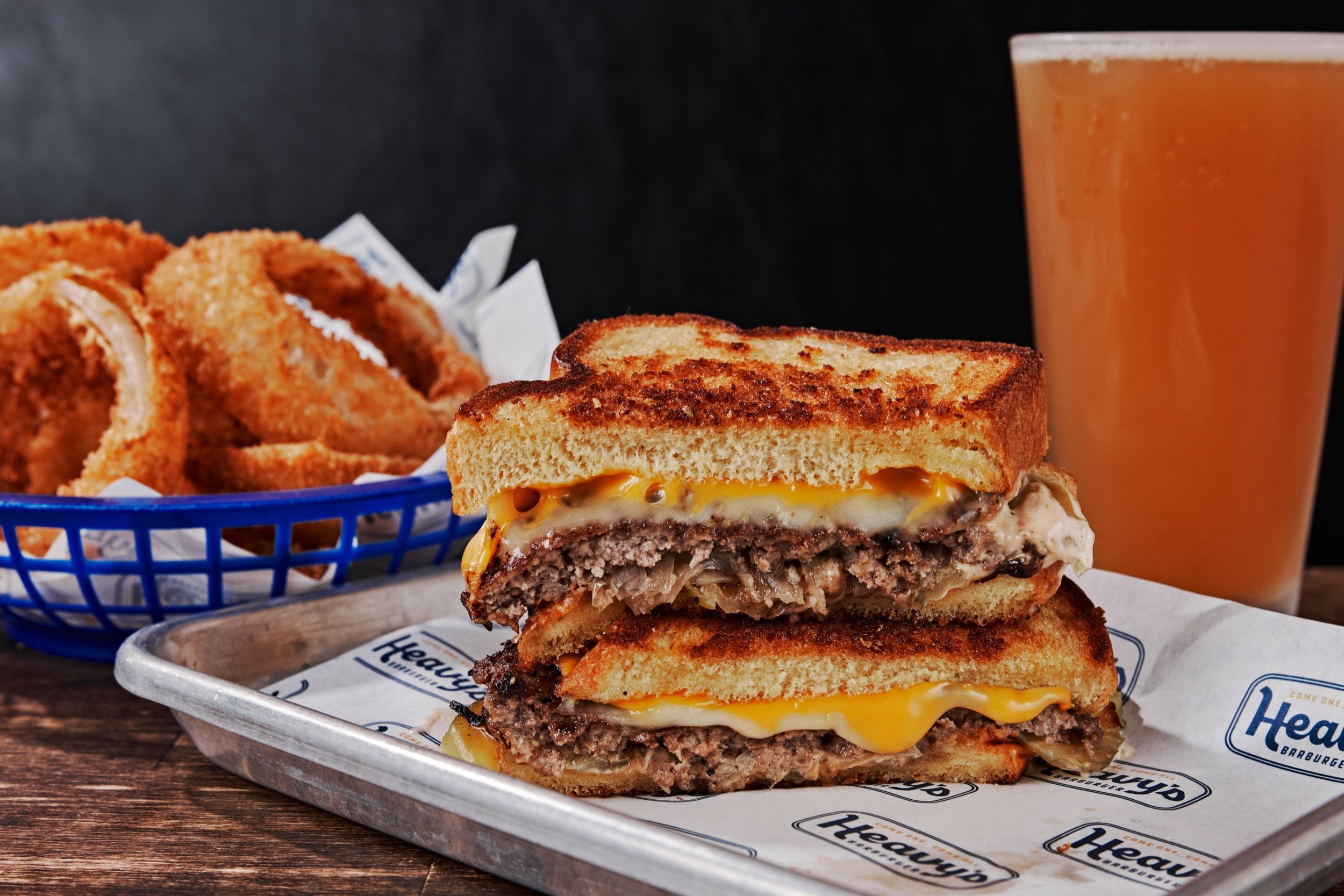 American & Swiss, Grilled Onions, Pickles, Heavy’s Sauce on Griddled Texas Toast